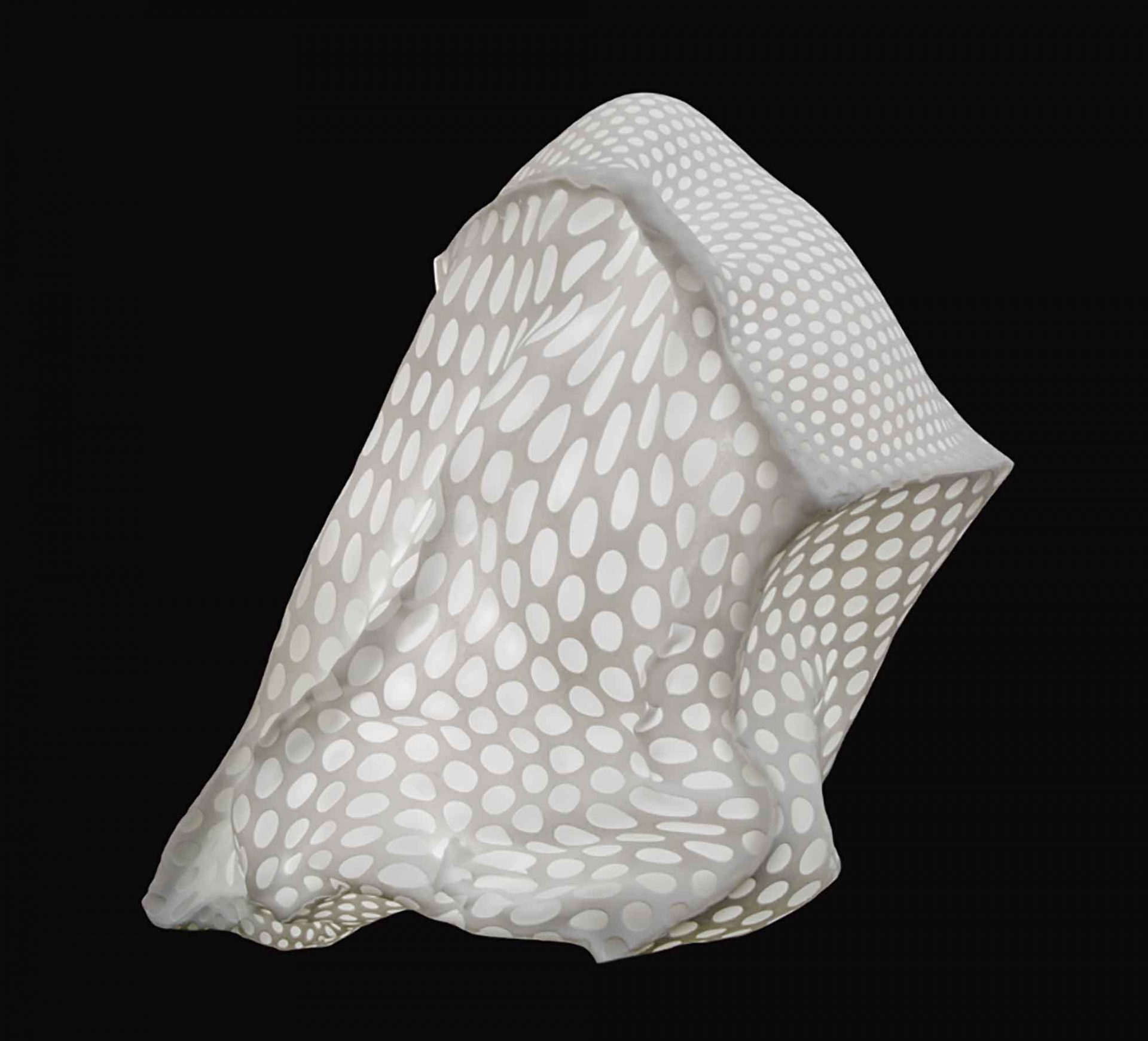 Fujikake first takes individual sheets of white-colored glass of 2 different gradations and sandblasts dotted perforations onto their surfaces after fusing the sheets together in a glory hole, thereby deepening the holes to heighten and accentuate the shadows that form on her glass surfaces. After this initial process, Fujikake further attaches 6 sheets within her glory hole to form an essentially rectangular shape. After this basic form is created, Fujikake incredibly begins to blow the melting glass, thereby helping to warp and expand the glass in a bubble-like form. Such voluptuous and seemingly impossible curvatures cannot be achieved by the use of sheet glass alone, and it is the combination of various glass techniques – kiln-working, sandblasting and blowing glass, that eloquently transforms her material into an entirely new style of glass for the 21st century.